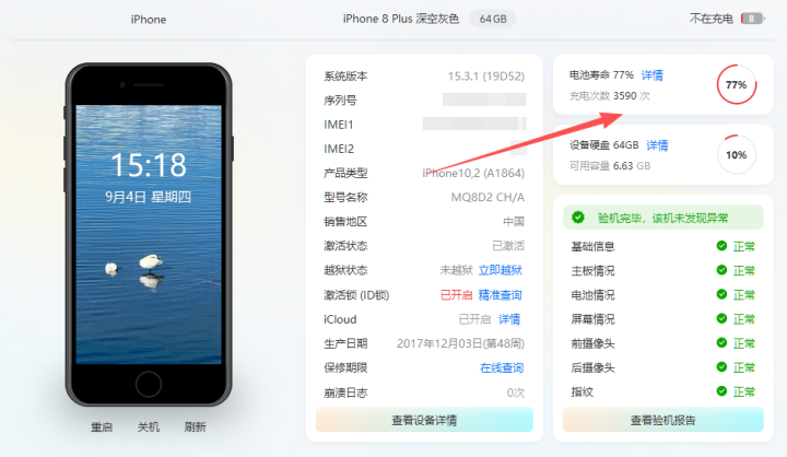 刚刚检测了一下我的iPhone 8P,充电次数已经高达3590次,这款手机我已经用了超过7年,直到今天都是全原无拆无修,真不愧是当年的机皇!